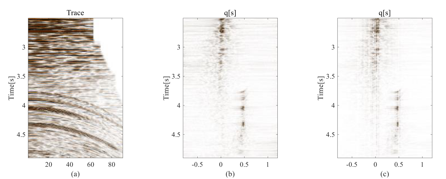(a) CMP道集;(b) 對比方法反演的Radon域數據;(c) 本文方法反演的Radon域數據