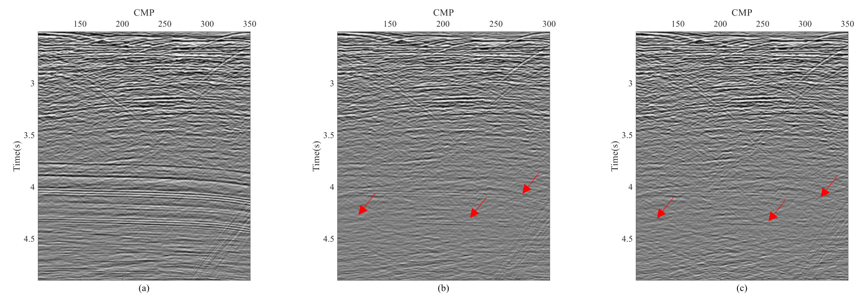 (a)原始疊加道集;經(b)對比方法,(c)本文方法進行多次波壓制