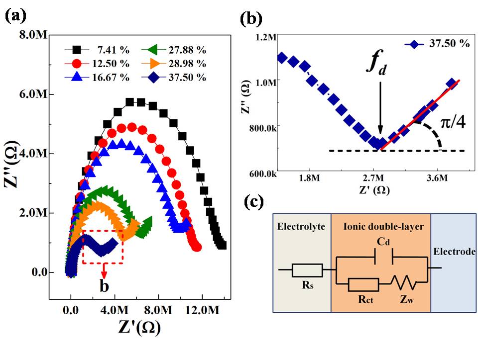 圖2 (a)不同含水率乳狀液的Nyquist圖; (b)37.5%含水率乳狀液在低頻段的Nyquist細節圖; (c) W/O型乳狀液的等效電路模型