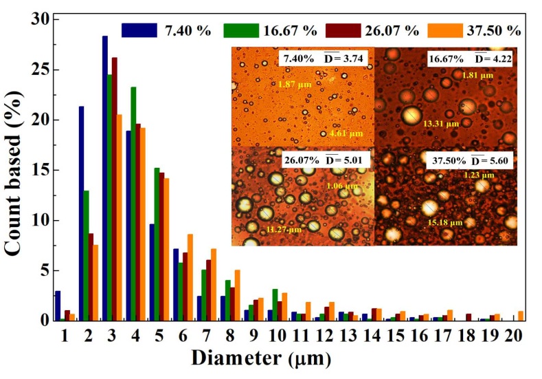 圖4 乳狀液微觀結構形態及液滴分布概率密度函數