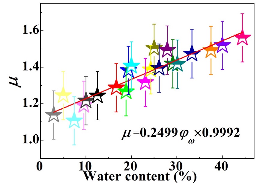 從圖4的液滴分布形態圖可以看出,含水率的增加直接導致了液滴粒徑尺寸和密度的增加,且粒徑分布也隨之呈現規律性的變化。如圖5所示,液滴粒徑分布的概率密度Log-normal函數中,用于表征對數平均值的參數μ與含水率存在線性相關性。這說明液滴粒徑線性主要依賴于乳狀液中的含水率,這也是阻抗響應特征與含水率具有相關性的直接原因。