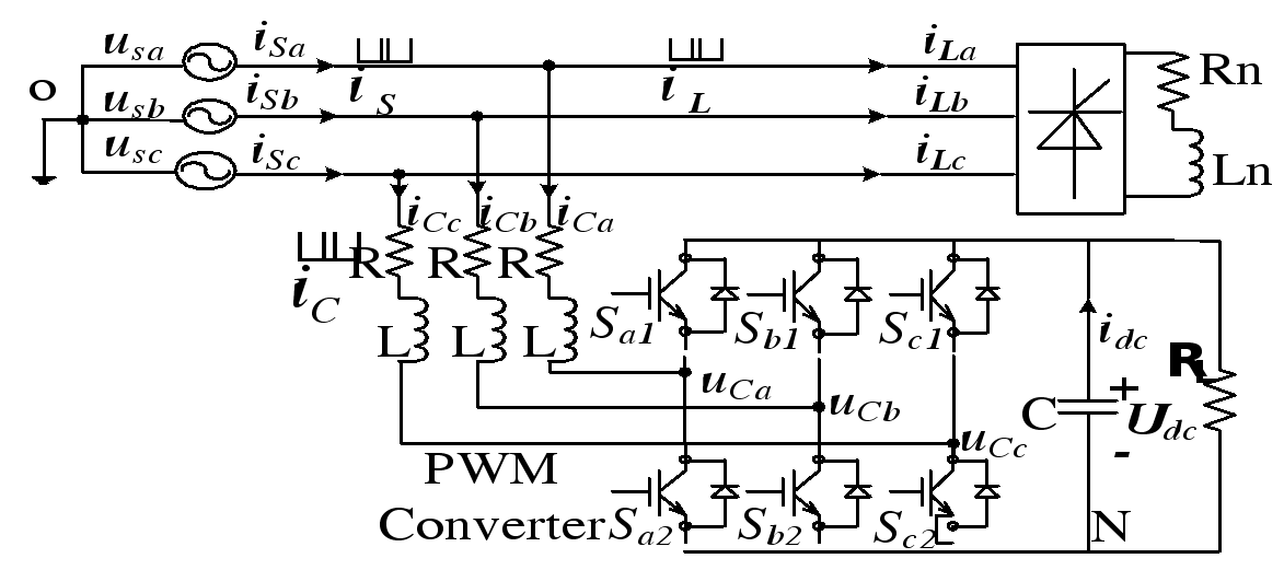 其中:iCa、iCb和iCc是APF輸出電流,uSa, uSb, 和 uSc是三相電網(wǎng)電壓,Sa, Sb, 和 Sc是六個(gè)開關(guān)管的占空比,且