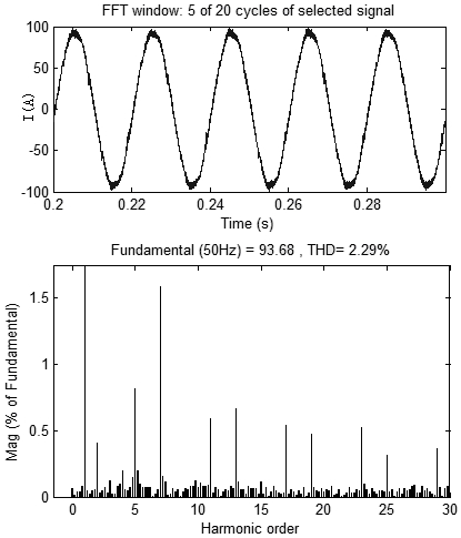 經(jīng)基于直接電源電流控制策略的APF補(bǔ)償后的網(wǎng)側(cè)電流基本為正弦波,且網(wǎng)側(cè)電流THD由投入前的26.7%下降到2.29%。