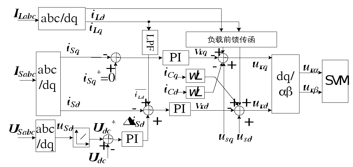 圖 3 dq坐標(biāo)系下APF電壓外環(huán)采用下垂調(diào)節(jié)器的控制框圖