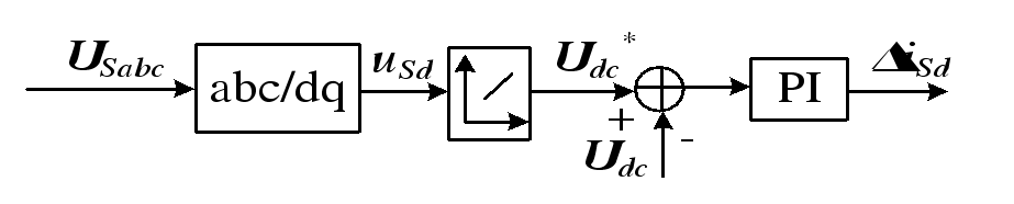 APF 直流側(cè)電壓指令值采用下垂調(diào)節(jié)器的控制策略如圖 3所示,電網(wǎng)電壓經(jīng)過abc /dq變換后經(jīng)過下垂控制器獲得參考電壓Udc* ,與實(shí)際采樣值Udc 比較后經(jīng)過PI 調(diào)節(jié)器輸出一個(gè)有功電流調(diào)節(jié)信號(hào)ΔiSd,引入到電流內(nèi)環(huán)來維持直流側(cè)電壓的穩(wěn)定,實(shí)現(xiàn)APF的雙閉環(huán)控制。