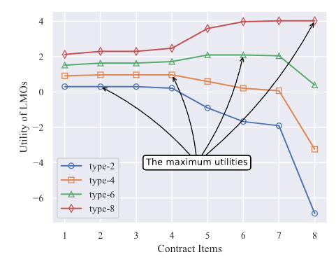 圖3顯示了本地模型擁有者在選擇任務(wù)發(fā)布者設(shè)計(jì)的不同契約條目時(shí)的效用。