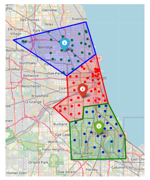 我們?cè)O(shè)計(jì)了大量模擬實(shí)驗(yàn),以評(píng)估弱不完全信息情景下契約設(shè)計(jì)的最優(yōu)性,以及強(qiáng)不完全信息情景下CDRL的性能。我們利用真實(shí)世界的數(shù)據(jù)Chicago Taxi Trips-2021進(jìn)行實(shí)驗(yàn)。通過使用K-means算法進(jìn)行區(qū)域劃分,劃分結(jié)果如圖2所示。