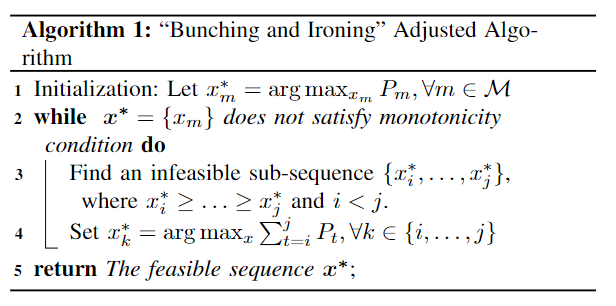 利用凸優(yōu)化工具,我們可以輕松得出最優(yōu)契約設(shè)計(jì)問題的最優(yōu)解,而無需考慮單調(diào)性條件的約束。當(dāng)本地模型擁有者的概率分布是均勻分布時(shí),解自然滿足單調(diào)性約束條件。否則,解有可能不滿足單調(diào)性約束。我們需要進(jìn)一步檢查解的單調(diào)性約束,使用“Bunching and Ironing”調(diào)整算法來解決不可行子序列問題。