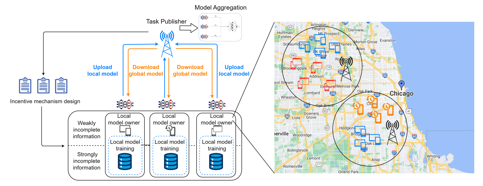 在這個(gè)框架中,我們有一個(gè)任務(wù)發(fā)布者,他將召集一些具有計(jì)算能力的本地模型擁有者來完成模型訓(xùn)練。具體來說,本地模型擁有者會(huì)根據(jù)其參與意愿,使其模型訓(xùn)練在數(shù)量和質(zhì)量上有所不同。因此,我們根據(jù)參與意愿的不同對(duì)所有本地模型擁有者進(jìn)行分類。在不失一般性的前提下,意愿越高,表明本地模型擁有者可以提供更高質(zhì)量或更多的數(shù)據(jù),為任務(wù)做出更大貢獻(xiàn),系統(tǒng)模型如如圖 1 所示。