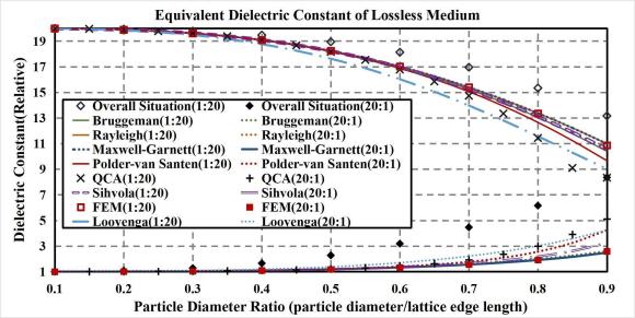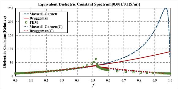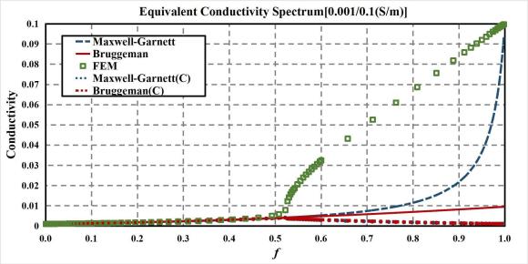 我們將首先回顧介質導電和極化基本理論背景,以及基于電磁場理論的宏觀電性計算方法。接下來,本文將全面回顧現有的常用混合電性計算的相關方法及其改進,并將其與數值計算方法的結果進行比較。通過對比發現,Sihvola獲得的電導率譜在高頻帶幾乎與Bruggeman的結果一致,但弛豫頻率位于較高的頻率范圍內,介電常數的估計并不理想。