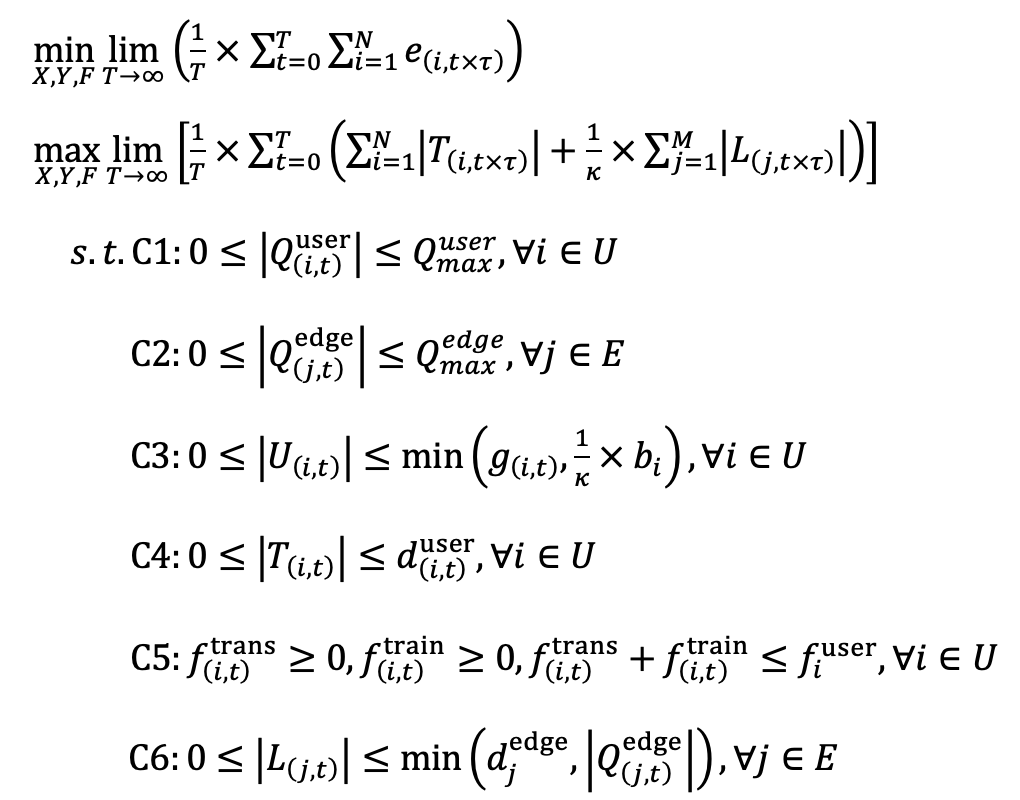 然后,本文對上述分布式機器學習系統的訓練任務排隊過程、隱私保護傳輸過程、機器學習訓練過程、移動設備電量消耗過程進行建模,將任務卸載的優(yōu)化問題規(guī)約為:
