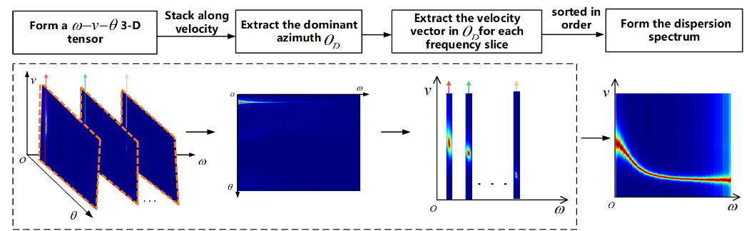 在頻率-方位-速度譜中沿主導方位切片提取主導方位下的頻率-速度譜,形成最終的頻散譜。