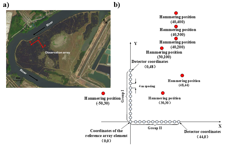 (a) 試驗場地衛星圖像; (b)觀測系統和震源分布情況