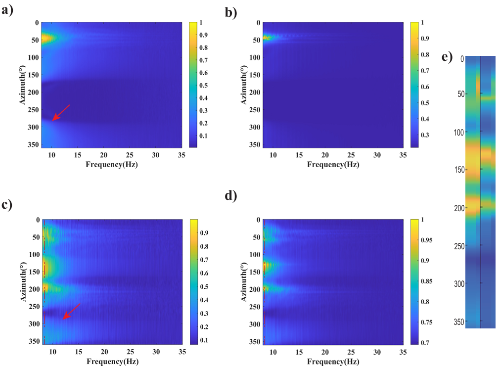 (c)和(d)多主導噪聲模型下的結果; (e)是在8Hz下從(c)和(d)中提取的方位譜對比