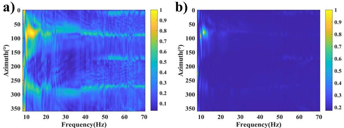 將上述的三維張量沿速度方向進行疊加,得到頻率-方位譜。其中,譜峰值處對應的方位作為噪聲源的主導方位。