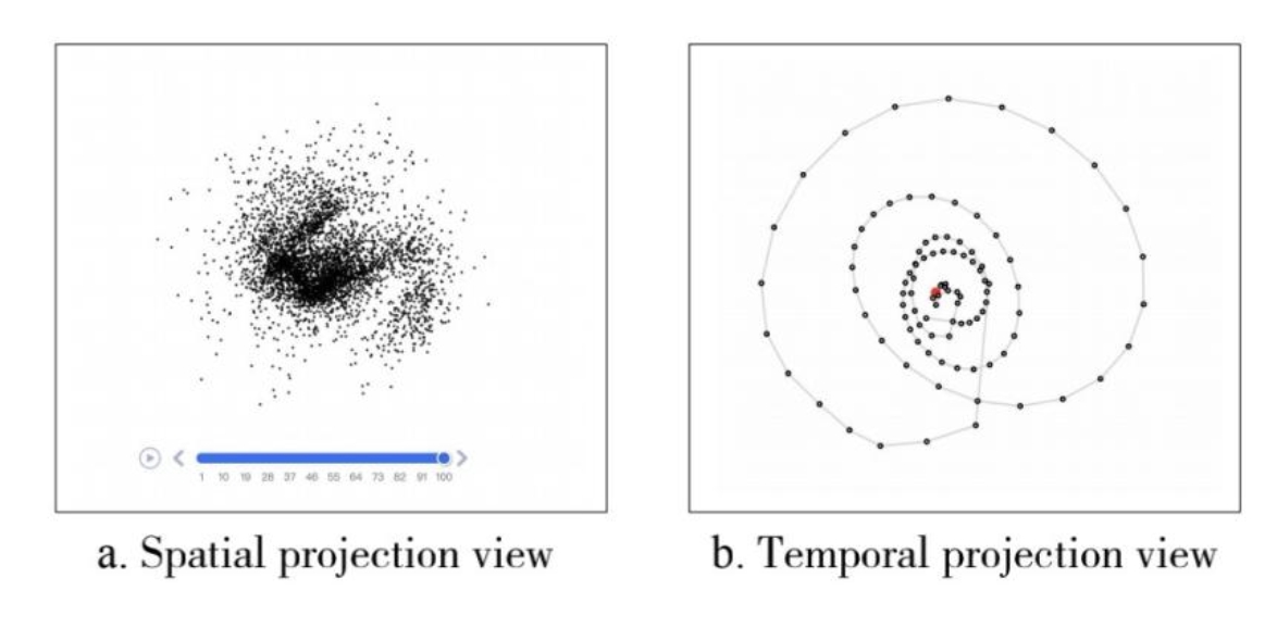 為了能夠全面有效地將降維結(jié)果進(jìn)行可視化,本文設(shè)計了空間投影和時序投影兩種視圖。分析人員可根據(jù)不同的分析任務(wù)選取不同分段下隱藏層激活狀態(tài),將其輸入到DR中,然后再將二維空間下的投影結(jié)果映射到相應(yīng)視圖中進(jìn)行探索和分析。