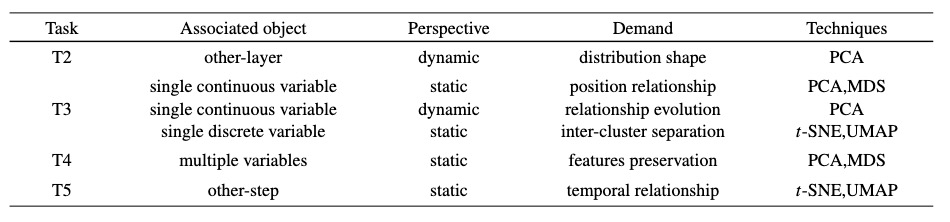 基于上述實驗結(jié)果,本文提煉了在LSTM隱藏層可視分析任務(wù)中選擇DR時必須考慮的幾個重要因素,包括任務(wù)的關(guān)聯(lián)對象、分析視角以及模式探索需求,并對它們適用的DR技術(shù)進(jìn)行了總結(jié),如表2所示。
