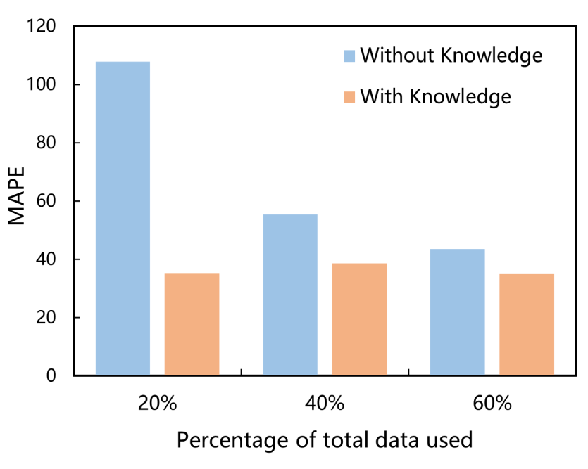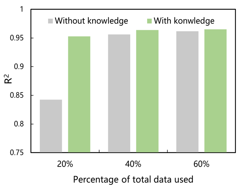 對于僅使用20%的數據集訓練的模型來說,機理知識的加入使MAPE降低了60%,R2提高了12%。這突出了機理知識在提供關鍵先驗信息方面的作用,使數據驅動的模型即使在有限的樣本下也能穩健地計算。隨著數據量的逐漸增加,機理知識對機器學習模型性能增強的影響逐漸減弱。