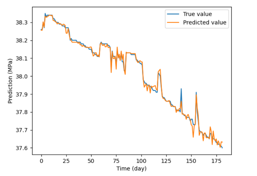 選擇鄰井175天的穩定生產期的生產數據和井下傳感器數據作為測試數據。應用知識指導的XGBoost模型進行壓力預測,結果如下:
