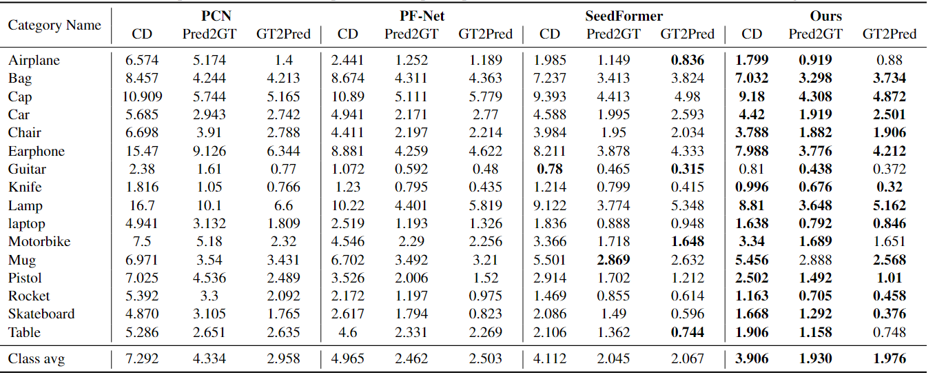 在 ShapeNet-part數據集上地表現如表1所示,我們的 RD-Net 在具有相同輸入和裁剪大小的 ShapeNet-part(16) 數據集的大多數類別上實現了最低的 CD 誤差。