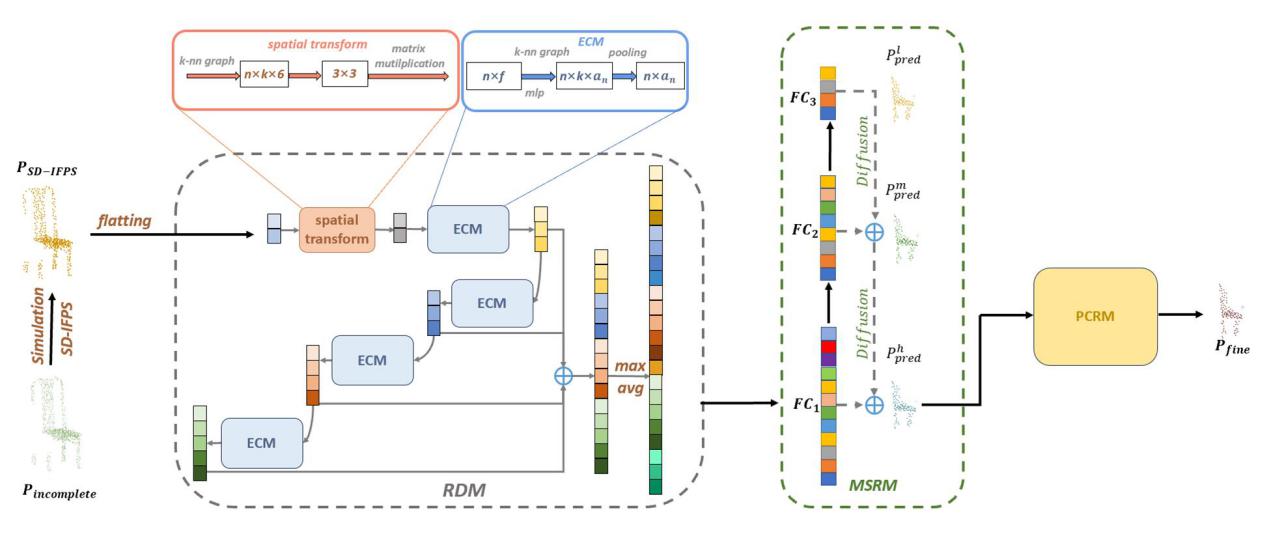 在本文中,我們提出了RD-Net用于高質量的點云補全。首先,SD-IFPS旨在提供一種高效的均勻采樣點提取方法。其次,RDM捕獲局部幾何特征,同時保持排列不變性,支持不同深度和尺度的層。第三,在保留現有輪廓的前提下,生成具有豐富語義輪廓和詳細特征的目標點云。最后,PCRM對完成的點云進行進一步細化。RD-Net完成局部形狀,提高補全質量。該模型在ShapeNet-part數據集上取得了較高的精度。