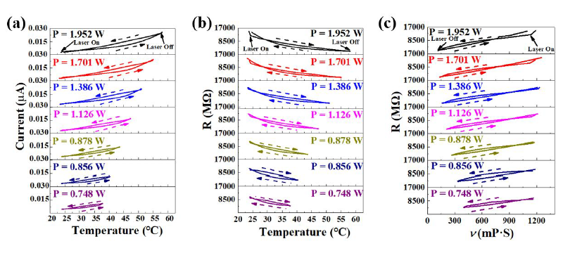 圖3(a)在不同激光功率下, 電流與溫度之間的關系;(b)在不同激光功率下,原油的電阻R隨著溫度的變化;(c)在不同激光功率下,原油的電阻R隨原油粘度v的變化。