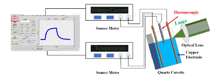 原油樣品來自委內瑞拉。為了降低原油中的水分含量,我們術對所研究的原油進行脫水。實驗過程中,樣品放置在長20mm、寬10mm、高45mm的石英比色皿中。我們利用波長為532 nm的激光輻射樣品,采集信號并加以分析。激光功率的調節范圍是0.748 ~ 1.952 W。我們使用Keithley 2400源電表提供偏壓(范圍從-50到170 V)并同時記錄電流。我們用兩種不同電導率的材料制作的熱偶溫度計對原油的溫度進行測量。
