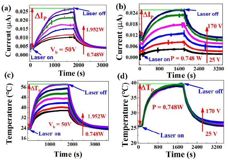 圖2(a)在不同激光功率下,原油樣品的電流隨時間的變化;(b)不同偏置電壓下,原油樣品的電流隨時間的變化;(c)在不同激光功率下測量電流時,原油溫度隨時間的變化;(d)在不同的偏置電壓下測量電流時,原油溫度隨時間的變化。