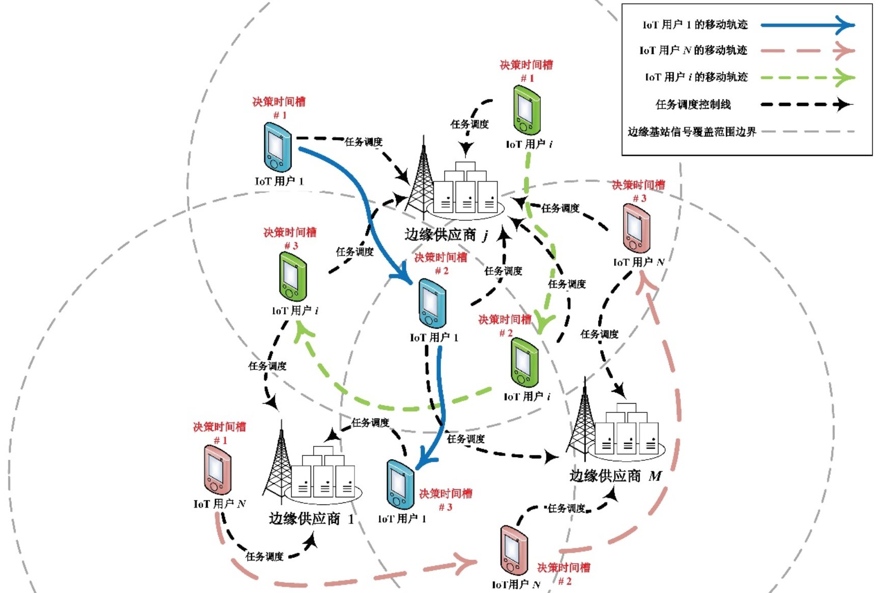 本部分的任務調度和資源管理充分了時間動態性,用戶跨邊緣基站的信號覆蓋范圍操作位置移動。任務調度和資源管理算法,在不同的時間槽下,根據當前各用戶位置和邊緣服務器計算資源使用情況,做出任務調度和資源管理的決策。決策結果滿足多用戶的QoS需求,并且最大化邊緣供應商的總服務收益,維護邊緣服務生態的可持續性發展。