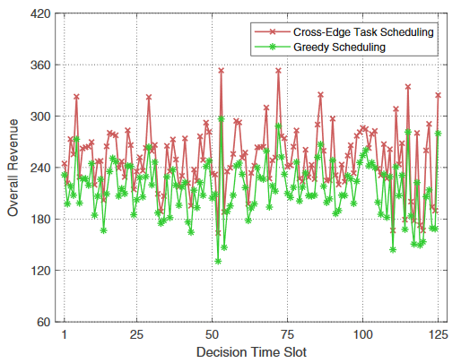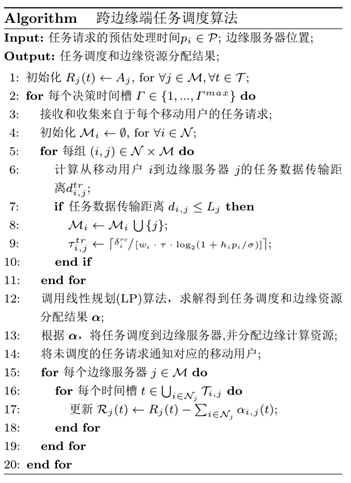 下圖算法敘述了跨邊緣端的任務調度和資源管理算法,實現了邊緣供應商收益的最大化。當為用戶的服務請求提供調度決策時,同時確定分配的邊緣資源數量。對任務調度和資源管理的決策沿著決策時間槽Γ動態執行;在每一決策時間槽Γ,更新各移動用戶的位置信息,收集新提出的任務請求,并依此操作決策。