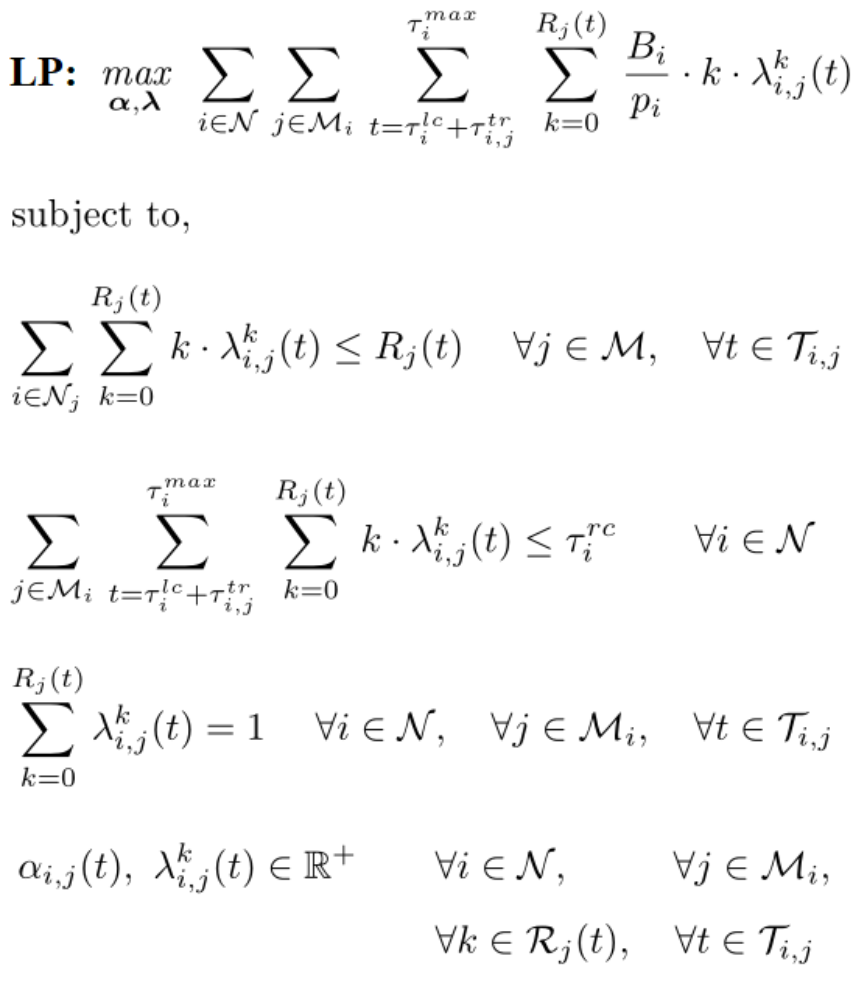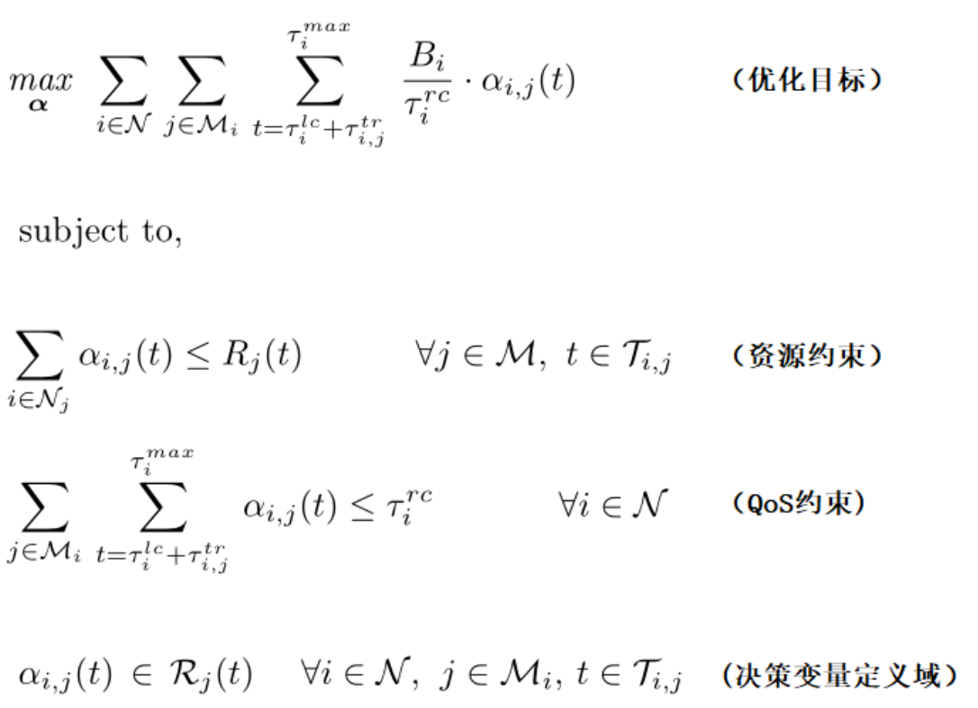 用戶發起的任務請求允許跨邊緣端地調度到多個邊緣服務器。αi,j(t)表示于時間槽t分配給用戶i的任務請求的、位于邊緣服務器j的資源實例數量。任務/資源的優化決策在每個決策時間槽Γ執行。優化目標是最大化邊緣供應商收益,收益來自各用戶上報的服務預算Bi。任務/資源優化模型的形式化定義如下圖所示,資源約束表示在每個時間槽t向所有用戶分配的總資源數量不超過資源容量,而QoS約束表示對任務請求i的調度和資源決策僅在任務執行期限