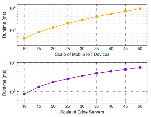 不同系統規模下的算法運行時(系統規模指,移動IoT設備/邊緣服務器的數量)