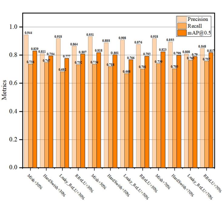 由于激活函數(shù)對(duì)稀疏訓(xùn)練有顯著影響,我們將激活函數(shù)替換為Mish/HardSwish/Leaky ReLU/RReLU進(jìn)行稀疏訓(xùn)練,并將剪枝率分別設(shè)置為30%、50%和70%。我們進(jìn)行了消融實(shí)驗(yàn),以比較不同激活函數(shù)對(duì)稀疏訓(xùn)練下模型檢測(cè)性能的影響。實(shí)驗(yàn)結(jié)果如圖6所示。