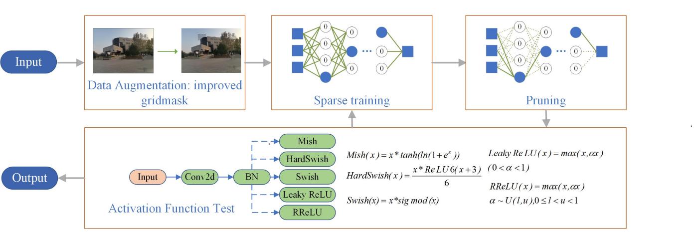 建筑物檢測(cè)方法的總體過(guò)程如圖1所示,包括以下步驟:(1)對(duì)數(shù)據(jù)集進(jìn)行數(shù)據(jù)增強(qiáng),并使用改進(jìn)的GridMask方法引入隨機(jī)噪聲來(lái)模擬實(shí)際遮擋情況。(2) 對(duì)改進(jìn)后的模型進(jìn)行稀疏訓(xùn)練,使BN層的參數(shù)接近0。(3) 我們根據(jù)剪枝率來(lái)裁剪BN層參數(shù)。(4) 我們用Mish代替激活函數(shù),并比較其與不同激活函數(shù)的有效性。