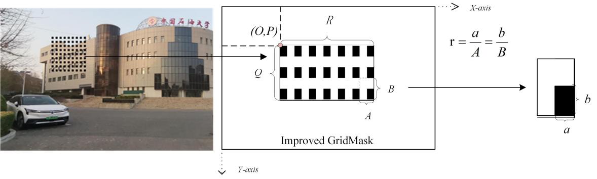 改進(jìn)版GridMask數(shù)據(jù)增強(qiáng)方法(如圖2所示):針對(duì)建筑檢測(cè)任務(wù)中建筑目標(biāo)面積較大的特點(diǎn),我們對(duì)原版的GridMask方法進(jìn)行了改進(jìn)。原始GridMask可能覆蓋整個(gè)建筑目標(biāo),影響模型的特征提取能力。因此,我們提出了將GridMask的分布細(xì)化為圖像中的隨機(jī)目標(biāo)區(qū)域的方法。這種方法能夠更準(zhǔn)確地模擬真實(shí)世界中的遮擋情況,因?yàn)樵趯?shí)際場(chǎng)景中,遮擋往往集中在圖像的特定區(qū)域而非整個(gè)圖像。我們首先按隨機(jī)比例縮小GridMask,以確保其不會(huì)占據(jù)過(guò)大的目標(biāo)區(qū)域。接著,在圖像中隨機(jī)分布這些縮小后的GridMask,以模擬實(shí)際識(shí)別過(guò)程中遮擋的隨機(jī)性。