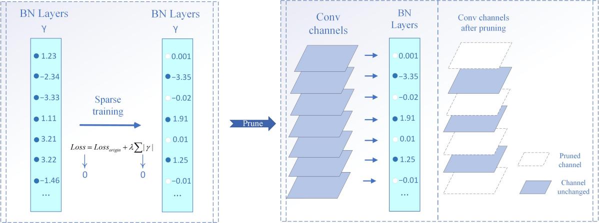 稀疏訓(xùn)練與剪枝(如圖3所示):在YOLOv5中,BN(Batch Normalization)層通過(guò)引入可學(xué)習(xí)參數(shù)γ和β來(lái)增強(qiáng)模型訓(xùn)練效率。當(dāng)γ和β接近0時(shí),BN層輸出趨于0,表明這些通道對(duì)網(wǎng)絡(luò)貢獻(xiàn)較小。根據(jù)劉壯等人的理論,稀疏訓(xùn)練利用L1正則化懲罰BN層內(nèi)的反向傳播梯度,使γ和β值趨近于0,減少剪枝對(duì)性能的影響。基于稀疏訓(xùn)練訓(xùn)練,我們剪枝具有較小γ和β值的通道及其對(duì)應(yīng)的卷積核,之后對(duì)模型進(jìn)行微調(diào)以補(bǔ)償剪枝帶來(lái)的性能損失。YOLOv5中BN層的密集分布使其成為模型優(yōu)化的關(guān)鍵。剪枝這些層能有效減小模型大小,且大多數(shù)BN層與前后卷積層通道一一對(duì)應(yīng),允許直接剪枝對(duì)應(yīng)通道,進(jìn)一步簡(jiǎn)化模型結(jié)構(gòu)。