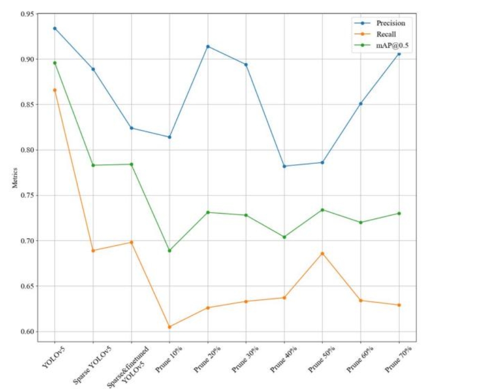 為了評(píng)估剪枝過(guò)程中的三個(gè)階段(稀疏訓(xùn)練、剪枝和微調(diào))對(duì)YOLOv5檢測(cè)性能的影響,我們比較了四種不同的模型,包括原始YOLOv5(YOLOv5)、稀疏訓(xùn)練的模型(稀疏YOLOv5。剪枝率從10%到90%不等,間隔為10%。實(shí)驗(yàn)結(jié)果如表三與圖5所示。