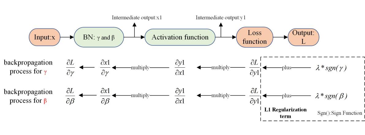 不同激活函數(shù)對(duì)模型性能的影響可歸因于梯度反向傳播和稀疏訓(xùn)練的機(jī)制。對(duì)于Conv模塊,反向傳播的梯度將從激活函數(shù)梯度傳輸?shù)紹N層,用于更新BN層參數(shù)。整個(gè)過(guò)程如圖7所示。損耗函數(shù)相對(duì)于BN層參數(shù)的梯度由四個(gè)部分組成:BN層輸出相對(duì)于BN層的梯度γ和β,激活函數(shù)的梯度,損耗函數(shù)相對(duì)于激活函數(shù)輸出的梯度,以及L1正則化帶來(lái)的梯度變化。BN層輸出相對(duì)于BN層參數(shù)的梯度和損失函數(shù)相對(duì)于激活函數(shù)輸出的梯度取決于網(wǎng)絡(luò)的輸入和輸出。此外,L1正則化產(chǎn)生的梯度變化是恒定的。因此,對(duì)于不同的激活函數(shù),損失函數(shù)相對(duì)于BN層參數(shù)的梯度可能不同,并且不同的激活功能可能影響L1正則化對(duì)梯度更新的影響,從而影響稀疏訓(xùn)練的效果。