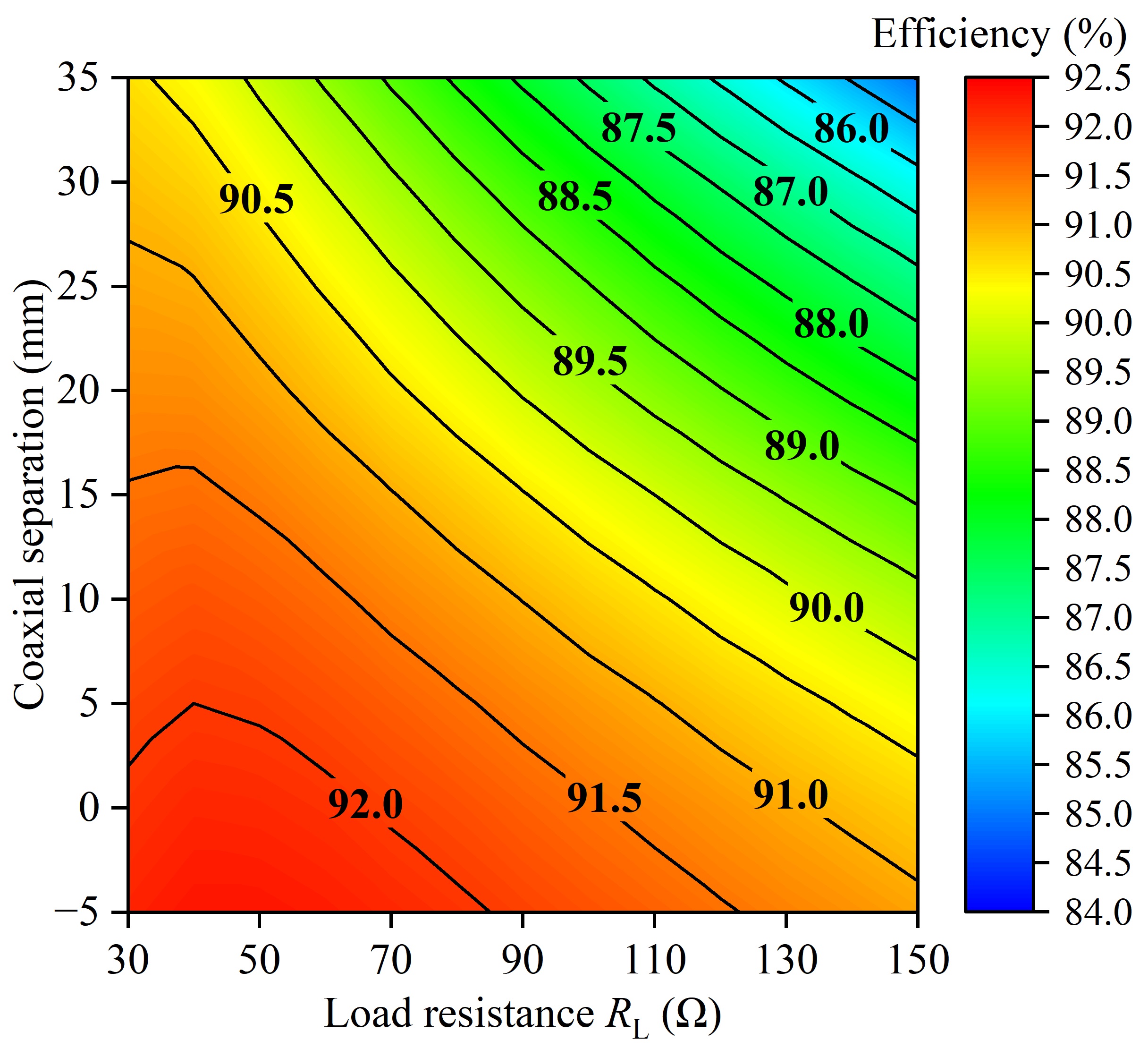 圖5為負(fù)載電壓UL隨線圈分離和負(fù)載變化的曲線。本文提出的旋轉(zhuǎn)式WPT系統(tǒng)在極端情況下電壓變化范圍為13.4%,參照國際標(biāo)準(zhǔn)EN 61000-3-3:2013和中國標(biāo)準(zhǔn)GB/T 12326-2008,該值在要求的±7%的標(biāo)準(zhǔn)限值內(nèi)。圖6為效率變化曲線,整體系統(tǒng)的平均效率為90.1%,在磁耦合機(jī)構(gòu)偏移和負(fù)載變化情況下系統(tǒng)仍能保持高效穩(wěn)定的電力輸出。