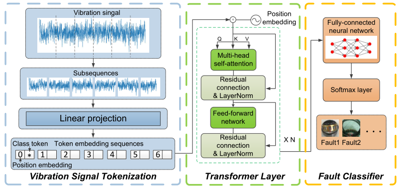 首先將輸入振動數據分割成多個子序列,使用線性投影層將子序列映射到高維嵌入空間。然后,引入了一個可學習的類令牌,與子序列向量組合產生一個無序令牌嵌入序列。由于故障發生后,振動信號總是發生變化,因此開發了批量重復的位置嵌入,將位置嵌入序列與無序令牌嵌入序列求和生成令牌嵌入序列。
