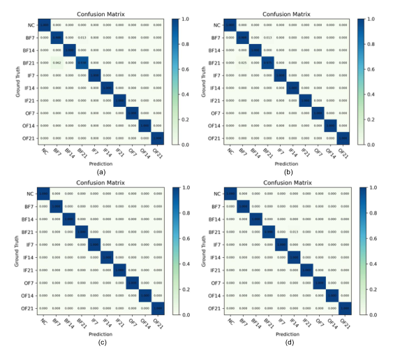 為了進一步評價VSTNN的故障診斷結果,圖2給出了4個數據集上最佳情況下VSTNN故障診斷結果的混淆矩陣。行顯示樣本的實際故障類別,列表示VSTNN預測的軸承故障類別。從結果可以看出,大部分誤分類類別集中在“BF”故障類別上,這表明該故障類別是軸承故障診斷的一個挑戰。