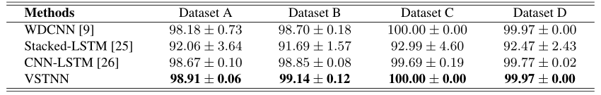 本文采用凱斯西儲大學公共軸承數據集來驗證所提出的VSTNN在軸承故障診斷中的有效性和優越性。以12 kHz的采樣率采集電機驅動端在四種不同工況下的振動信號。四種不同方法在四種不同工況數據集下的平均診斷準確率如表1所示。很明顯,所提出的VSTNN在診斷準確性方面在統計上優于其他方法,證明了其優越性。此外,可以觀察到,與之前的方法相比,所提出的VSTNN獲得了最小的方差,這表明了它的穩定性。