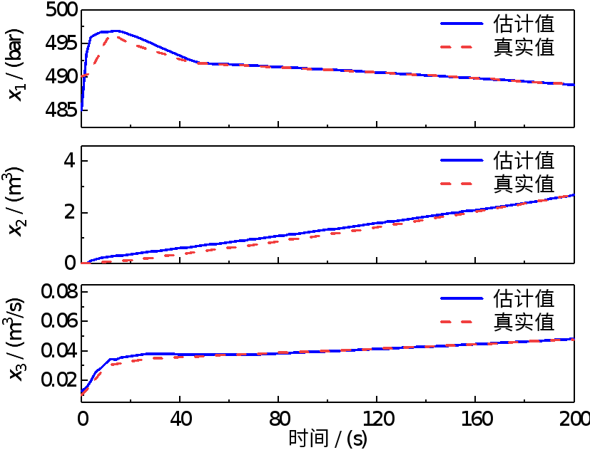 圖4仿真結果表明:不確定參數均能在60s內收斂至真實值,收斂速度快且估計結果準確。由圖5仿真結果可知:在氣侵工況下,本文所提自適應觀測器能夠使估計值在60s內跟蹤上正在變化的井底壓力和出口流量,且后續的估計誤差幾乎為0,體現了觀測器良好的跟蹤性能。自適應觀測器在60s時對氣體體積的估計誤差為0.21m3,在120s時估計誤差縮小至0.15m3,在180s后估計誤差幾乎為0。表明本文所提自適應觀測器在不確定參數給定初值與真實值相差較大時,仍能將不確定參數收斂至真實值。自適應觀測器對井筒內氣體體積的估計效果良好,估計誤差能夠保持在很小的區間內并持續縮小至0。