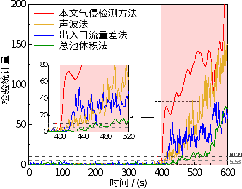 對比分析可知,特別在氣侵程度較小的情況下,本文氣侵早期檢測方法相較于聲波法、出入口流量差法和總池體積法表現出更好的診斷性能,能夠及時且靈敏地檢測出氣侵。