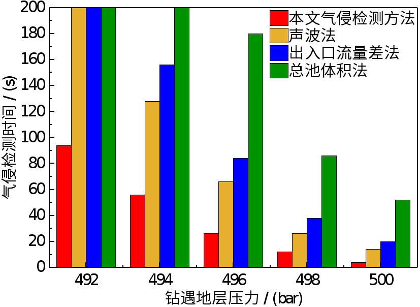 對比其他三種方法的檢驗統計量變化顯著程度,該方法遠大于其他檢測方法,可有效避免誤報警。此外,為充分說明本文氣侵早期檢測方法的有效性,對比分析了不同氣侵程度下四種檢測方法的氣侵檢測時間。