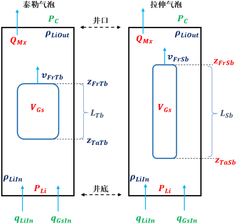 為模擬侵入井筒內氣體的運動,將整個井筒看作一個固定邊界的控制體積(Control Volume, CV),且CV中僅包含一個氣泡,氣泡的描述采用“雙形”氣泡表示方法。