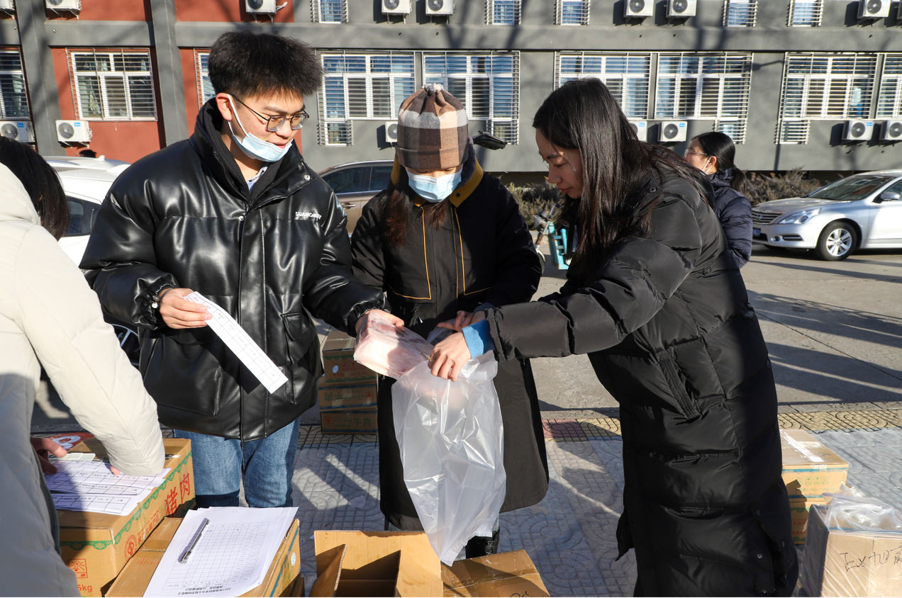 12月29日上午,南華縣的肉品到達學校,為方便老師教職工領(lǐng)取,減少現(xiàn)場等待時間,院辦人員冒著嚴寒,提前到達現(xiàn)場,把每位教師的扶貧物資用包裝袋單獨包裝,袋子上用記號筆標注姓名,并打印了標有姓名、物資種類及數(shù)量的“發(fā)放條”以備老師們核對。開始領(lǐng)取后,分發(fā)現(xiàn)場順利有序,不到一個小時,一百多箱物資就被已領(lǐng)取完畢。