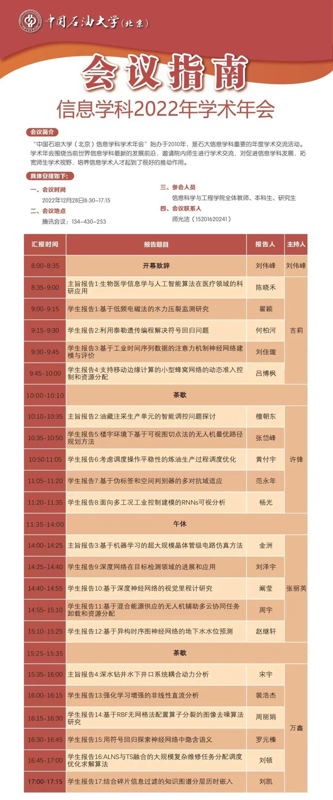 12月28日,“中國石油大學(北京)2022年信息學科學術年會”通過線上會議平臺舉辦,300余名學院師生線上參加會議,院長劉偉峰擔任開幕式主持人并致辭。