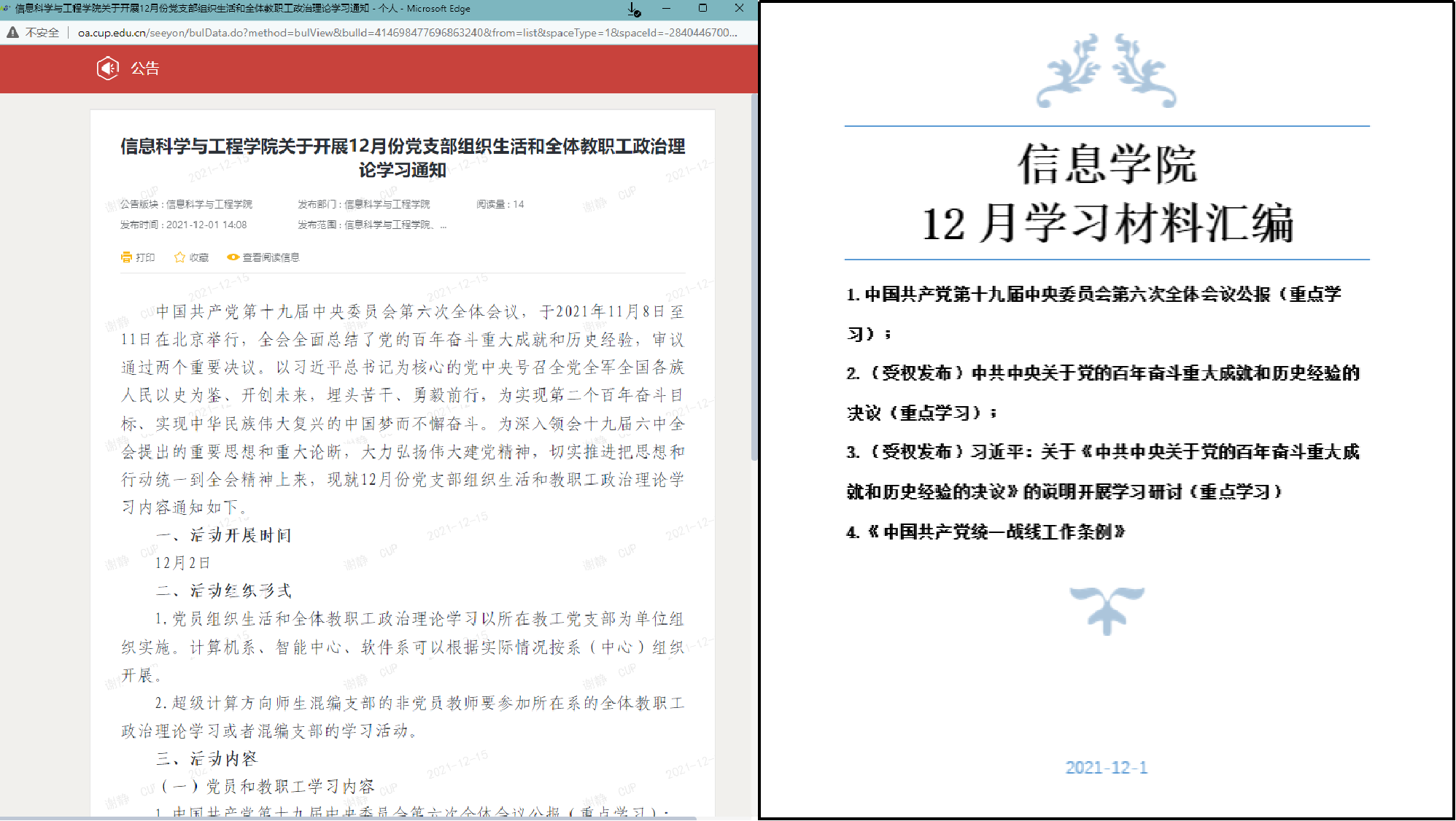 為使學(xué)習(xí)入腦入心,學(xué)院黨委制作了學(xué)習(xí)材料匯編和學(xué)習(xí)課件,學(xué)院領(lǐng)導(dǎo)班子成員傳達學(xué)習(xí)了《中國共產(chǎn)黨第十九屆中央委員會第六次全體會議公報》,全面介紹了十九屆六中全會召開的概況,并就會議召開的背景、黨的百年奮斗重大成就和歷史經(jīng)驗等進行了重點解讀。教工黨支部書記重點解讀《中共中央關(guān)于黨的百年奮斗重大成就和歷史經(jīng)驗的決議》,參會教職工交流了自己的學(xué)習(xí)體會和心得。