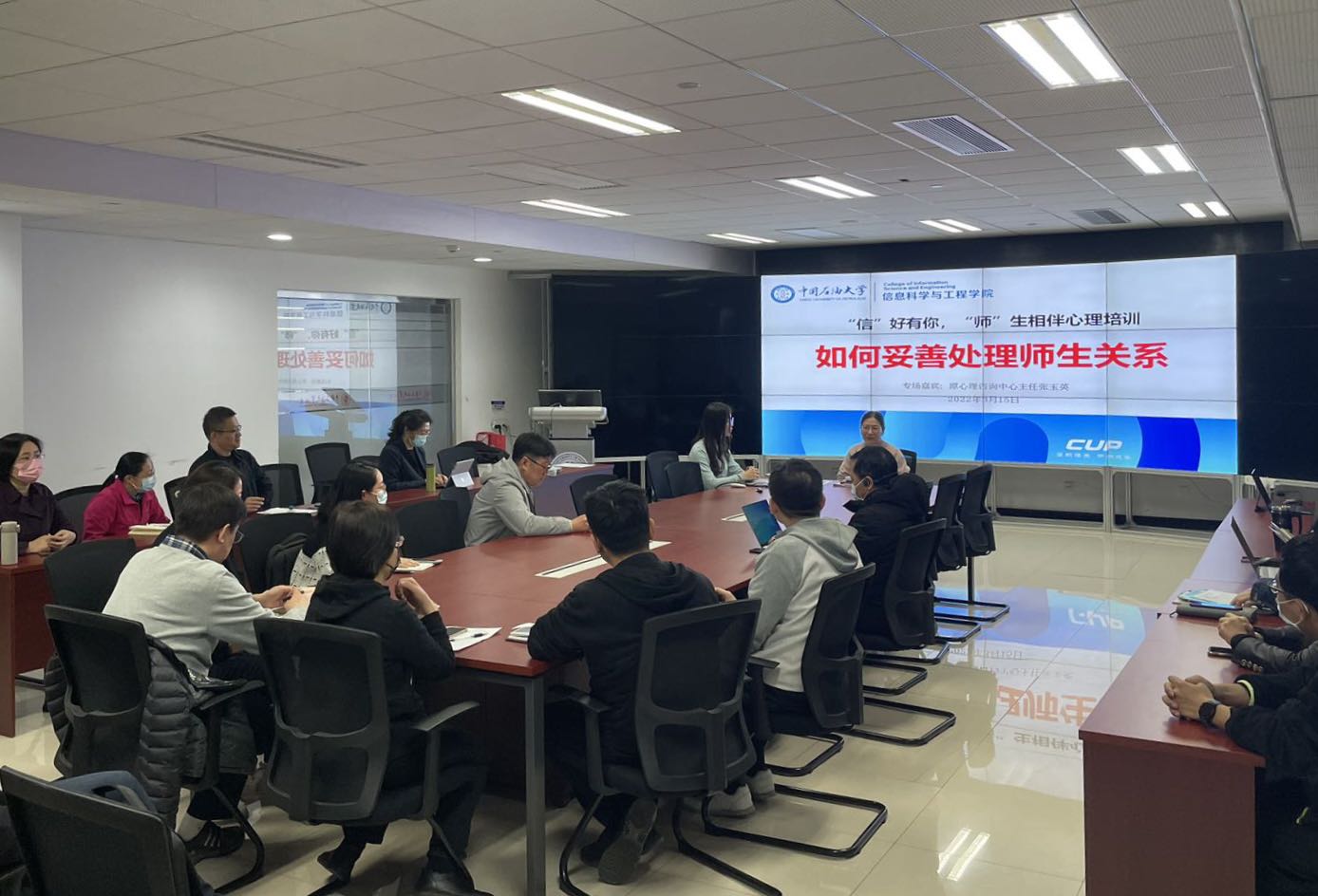 為進一步加強學院新任班主任和學業(yè)導師隊伍的專業(yè)化建設,更好地開展學生日常溝通和心理輔導工作,3月15日上午,信息科學與工程學院組在主樓B1421會議室召開題為“如何妥善處理師生關系”的心理專題培訓,培訓邀請學校原心理咨詢中心主任張玉英主講,學院新聘任的班主任、學業(yè)導師和研究生導師參加培訓。
